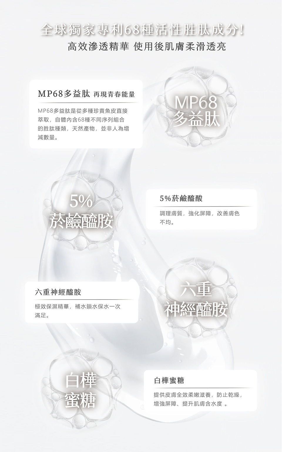 • 點亮肌膚,重塑光采 • 融合5%菸醯胺與抗老胜肽,提升肌膚亮度,均勻膚色,深層滋養修護,打造柔嫩膚觸。六重神經醯胺強化屏障鎖水,七重玻尿酸分子群多層補水,賦予肌膚水光潤澤。服貼的醣醛酸面膜高效滲透精華,使用後肌膚柔滑透亮,散發晶透光采,為日常護膚帶來奢華享受。